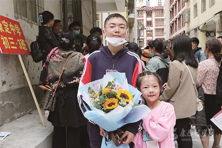 图为妹妹为参加中考的哥哥献上鲜花。
