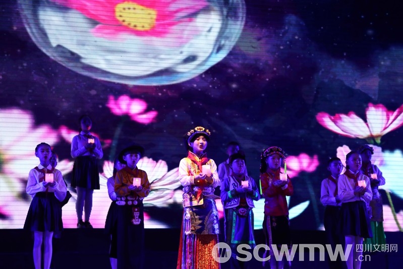 “格桑花儿开, 阿真叔叔为何不回来,思念泪水汇成海,我们等着叔叔再回来……”在童声合唱的原创歌曲《格桑花儿开》中,来自阿坝州外国语实验小学的22名学生,胸前戴着红领巾,身着民族服饰,手捧蜡烛,唱出了对英雄阿真能周的怀念。