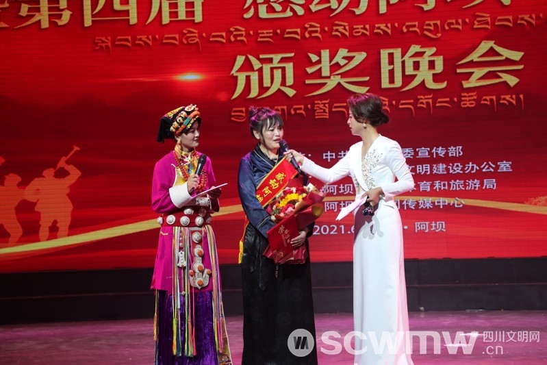 在颁奖环节,身着嘉绒藏族服饰的阿娟笑容款款走上舞台,接过证书和奖杯。