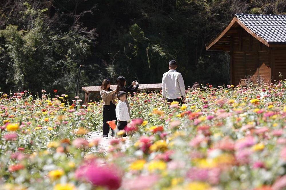 记者进入“梅朵廊庄”看见一朵朵百日花竞相开放,像各种颜料打翻在地,与远处的森林、雪山交相辉映,宛如一幅田园风景画。