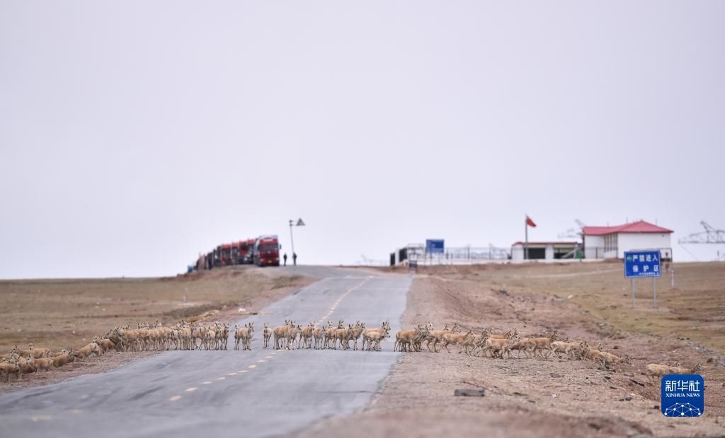 在青海可可西里,一群雌性待产藏羚羊正在通过青藏公路(2016年6月7日摄)。新华社记者 吴刚 摄