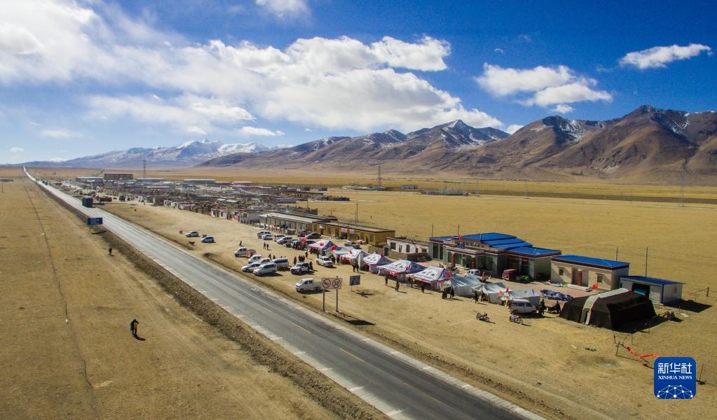 这是在青藏公路旁搭建的那曲县香茂乡畜产品展销会(2017年11月25日摄,无人机照片)。新华社记者 刘东君 摄