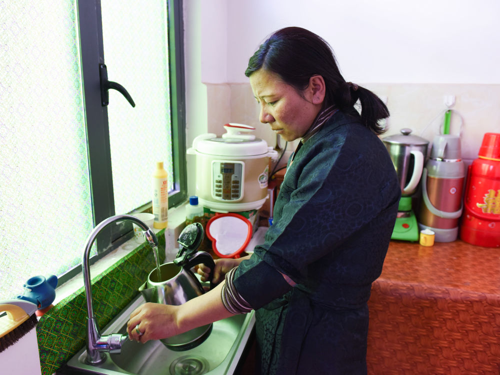 西藏山南市贡嘎县森布日极高海拔生态搬迁安置点内,村民次仁卓嘎在家里用上了自来水。(2020年1月12日摄)。新华社记者 田金文 摄