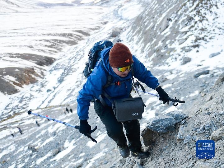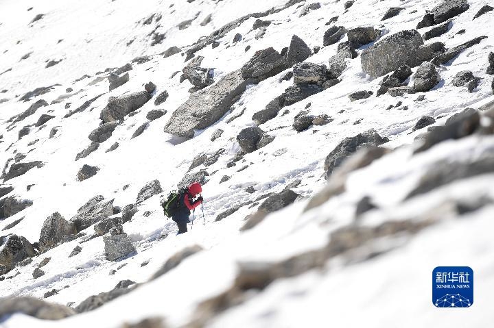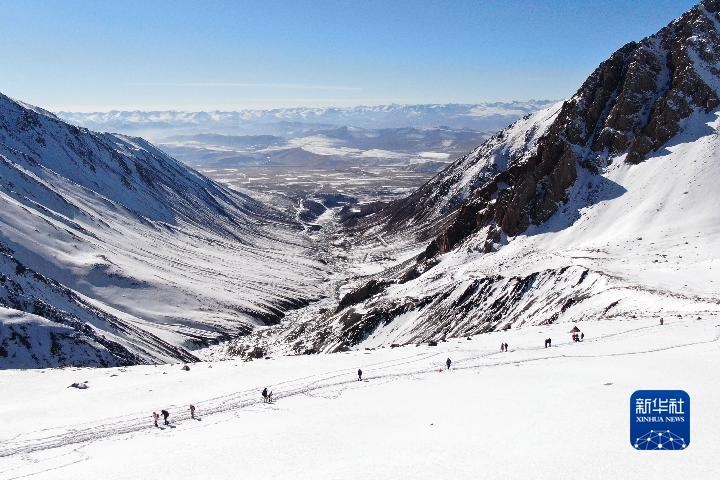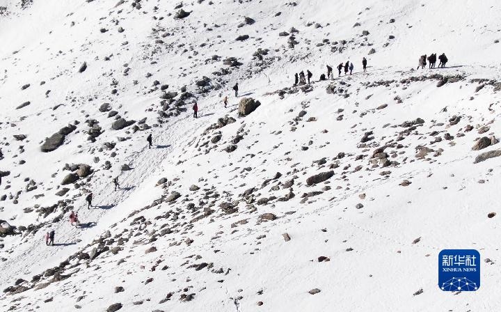 1月1日,登山爱好者攀登岗什卡雪峰(无人机照片)。