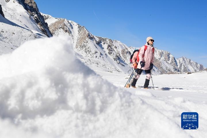 当日,在青海省海北藏族自治州门源回族自治县,登山爱好者们攀登岗什卡雪峰,在山巅和雪原中度过新年第一天。