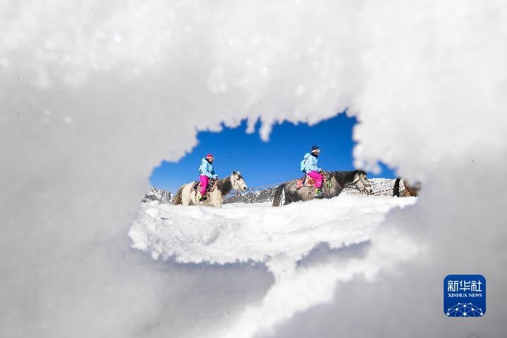 1月1日,登山者的马队在岗什卡雪峰的雪原上行进。新华社记者 张龙 摄