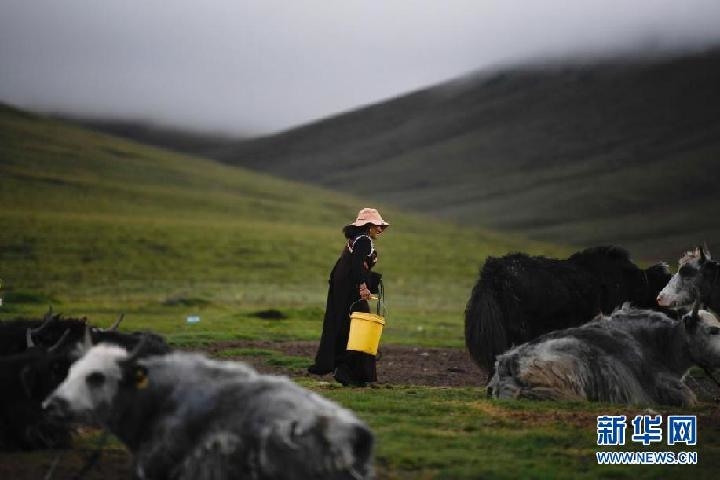 2021年8月3日,在果洛州玛沁县当洛乡贡龙村的夏季草场上,牧民准备挤牛奶。新华社记者 张龙 摄