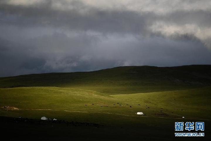 2021年8月3日,在青海省果洛藏族自治州玛沁县当洛乡贡龙村拍摄的夏季草场。新华社记者 张龙 摄