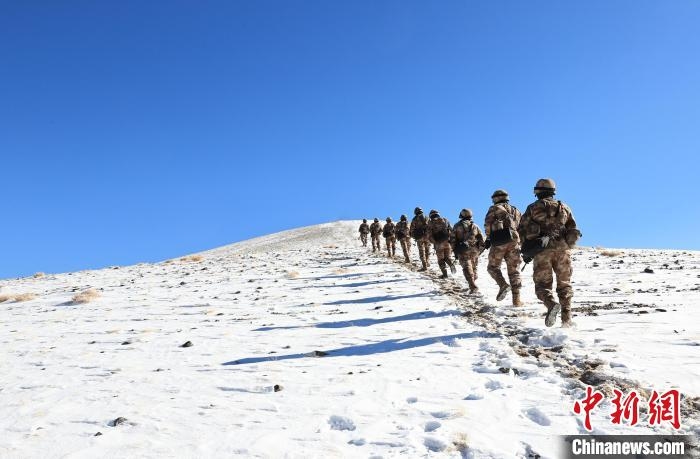 西藏阿里官兵踏雪巡逻 守卫边疆安全