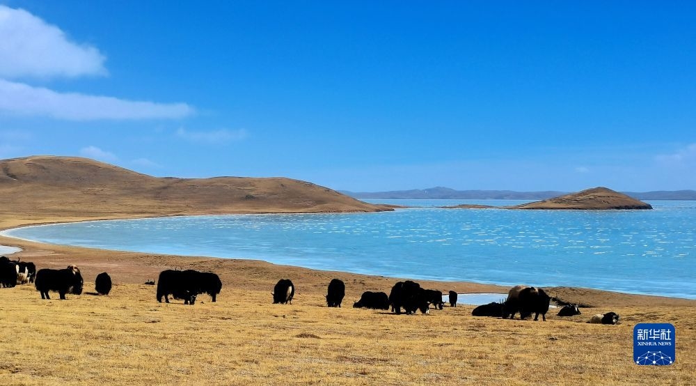 在三江源国家公园黄河源园区拍摄的扎陵湖畔,水草丰美,牦牛成群。(新华社记者 吕雪莉 摄)