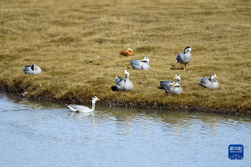 在三江源国家公园黄河源园区拍摄的一群斑头雁。(新华社记者 李占轶 摄)