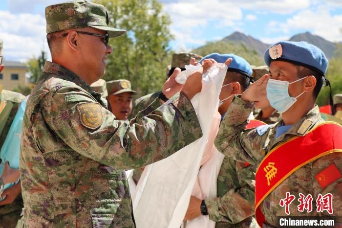 用哈达和鲜花迎接维和部队官兵。彭毅摄