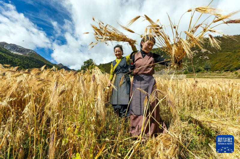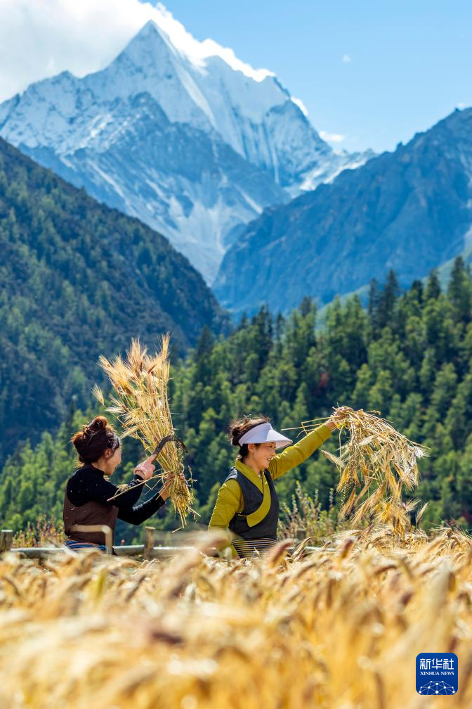 10月12日,在四川甘孜藏族自治州稻城县亚丁村,村民泽仁拉姆(右一)在收割青稞。新华社记者 黄晓勇 摄