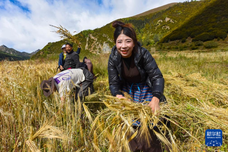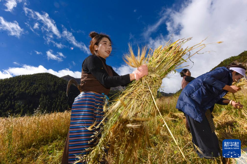 10月12日,在四川甘孜藏族自治州稻城县亚丁村,村民泽仁拉姆(左一)在收割青稞。新华社记者 黄晓勇 摄