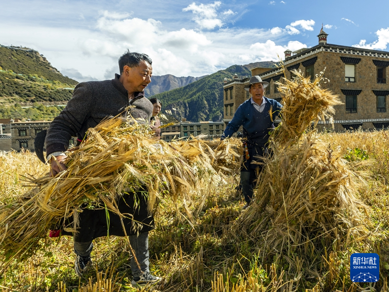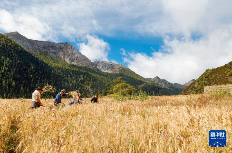 10月12日,在四川甘孜藏族自治州稻城县亚丁村,村民在收割青稞。新华社记者 牛晓雷 摄
