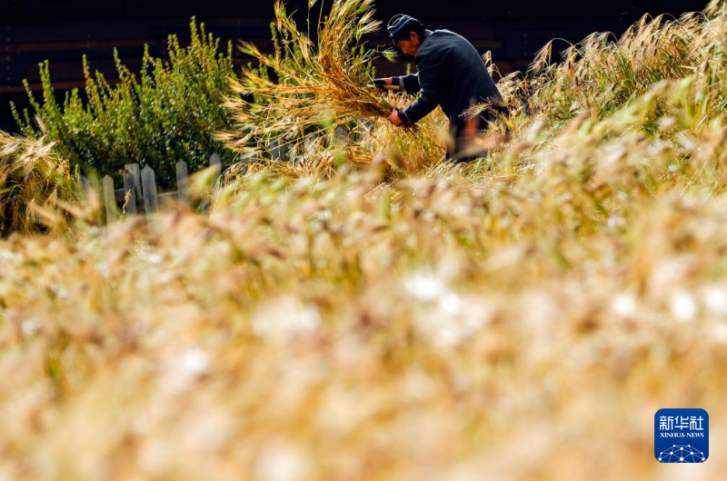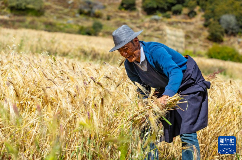 10月12日,在四川甘孜藏族自治州稻城县亚丁村,村民在收割青稞。新华社记者 沈伯韩 摄