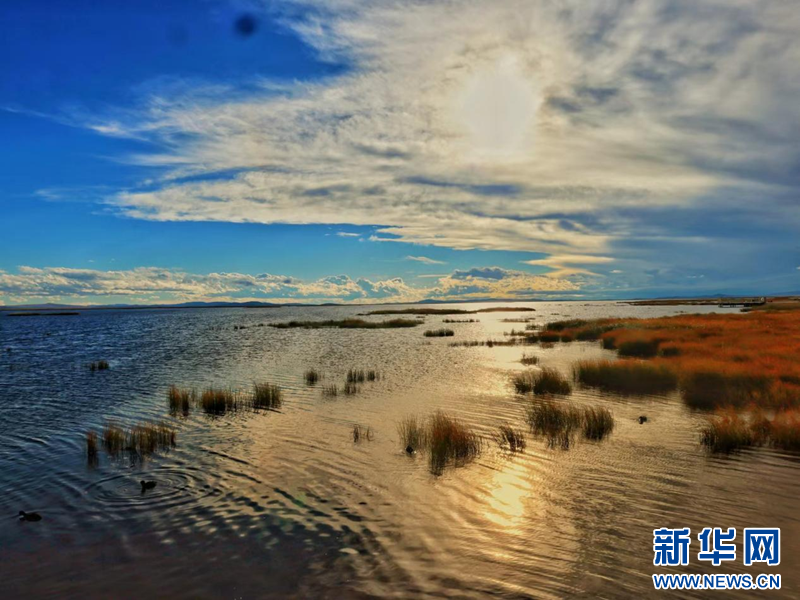 若尔盖花湖波光粼粼,映照着蓝天白云。新华网发 夏雪东尔 摄