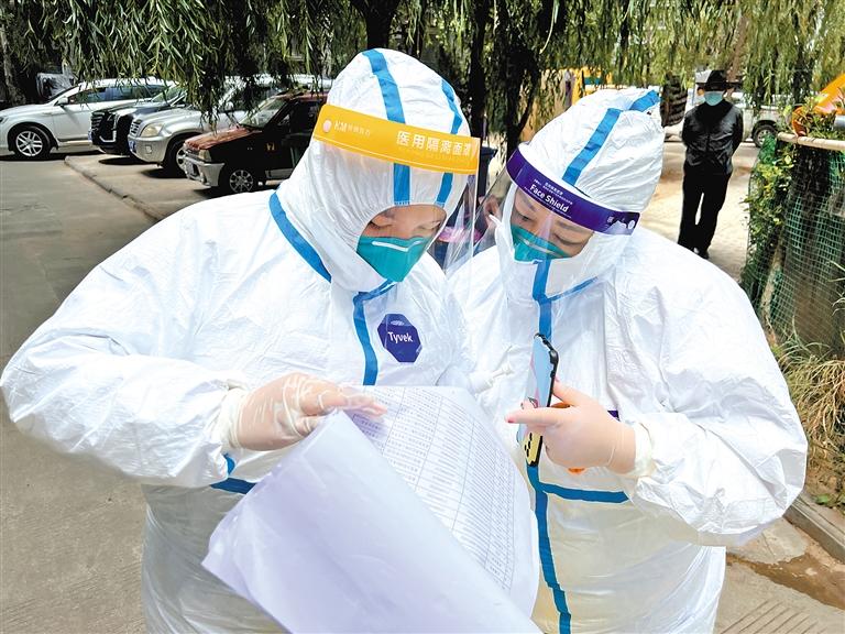 西藏暖风公益团队大学生志愿者,在拉萨疫情期间配合社区医护人员开展核酸检测工作。