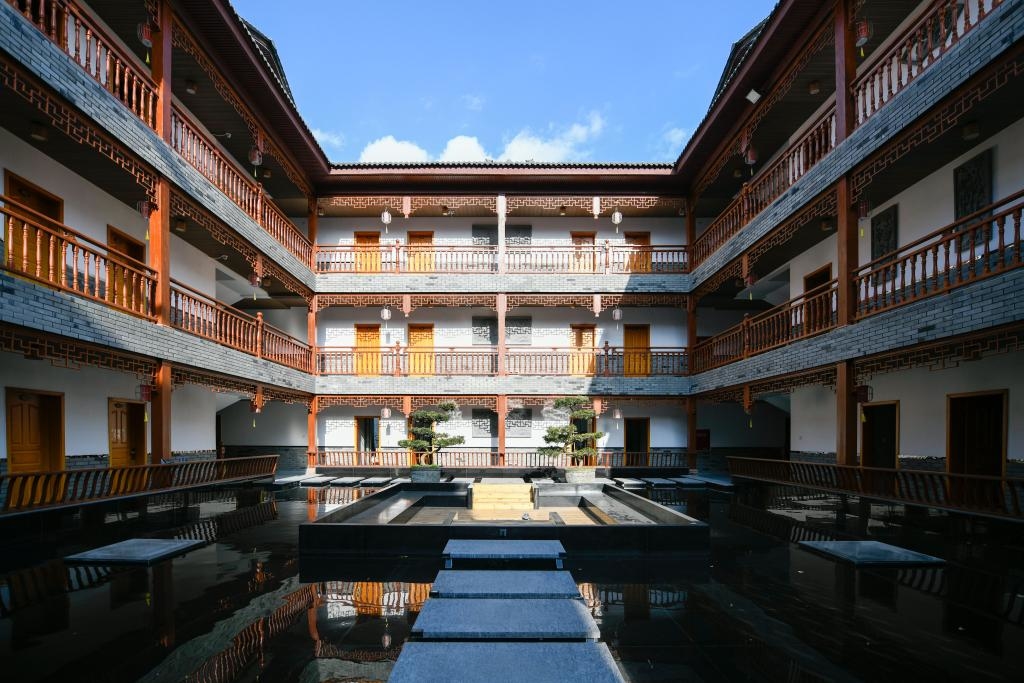 在景区入口磨西镇上,有一家徽派建筑风格的民宿“杨家小院”。步入庭院,石头屏风后流水潺潺,配上亭台楼阁颇有诗意。