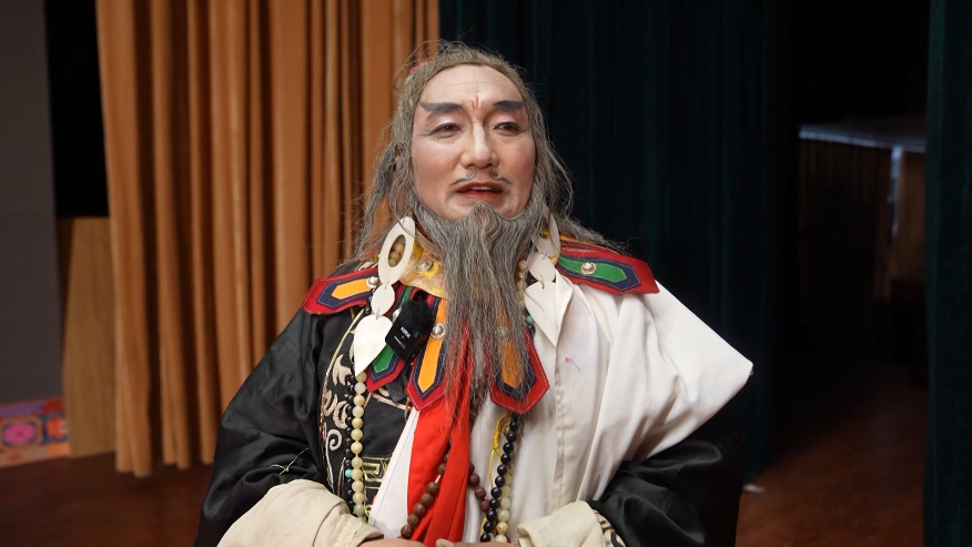 阿克晁同扮演者所郎旺修介绍:“从1980年到现在,过年期间我们都会到色达广场免费给群众表演许多歌舞节目和藏戏等,今年也会给大家表演格萨尔王传里的一些章节和藏戏,最后祝大家扎西德勒。”