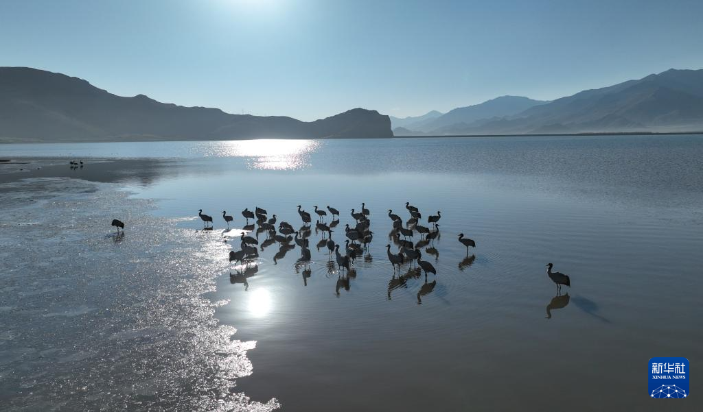 这是在林周县虎头山水库拍摄的黑颈鹤(3月17日摄,无人机照片)。新华社记者 晋美多吉 摄