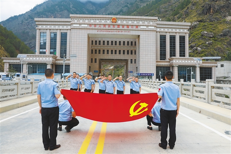图为吉隆出入境边防检查站组织党员民警在国门前重温入党誓词。记者 旦增兰泽 通讯员 肖富贵 摄