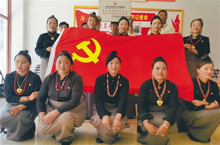 图为昌都市察雅县卡贡乡卡贡村党员们与党旗合影。记者 万慧 通讯员 刘林晓 摄