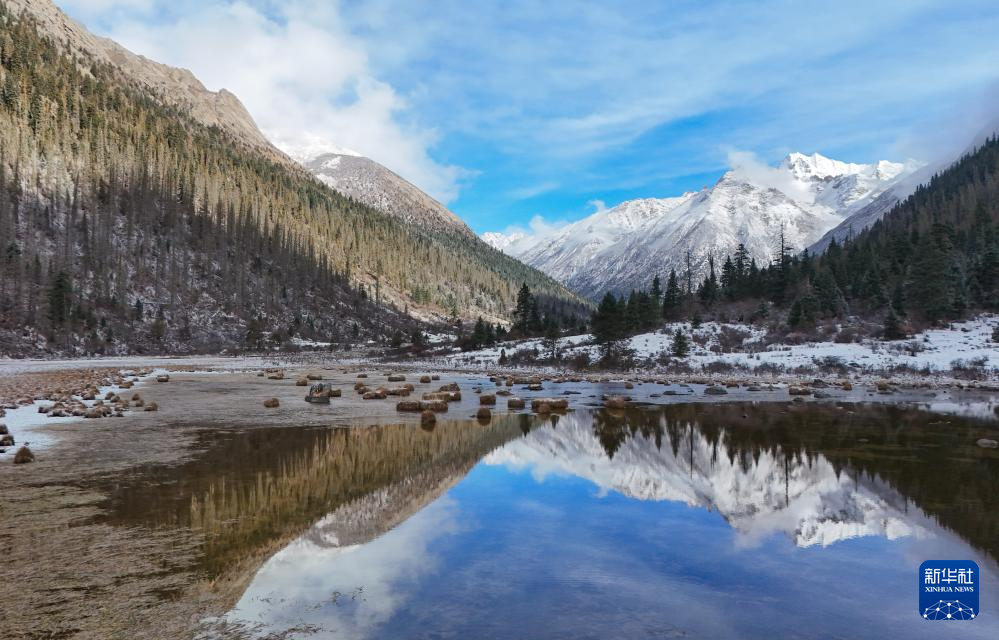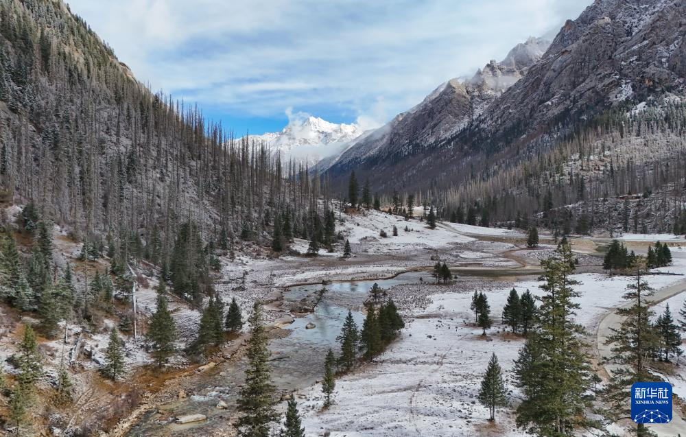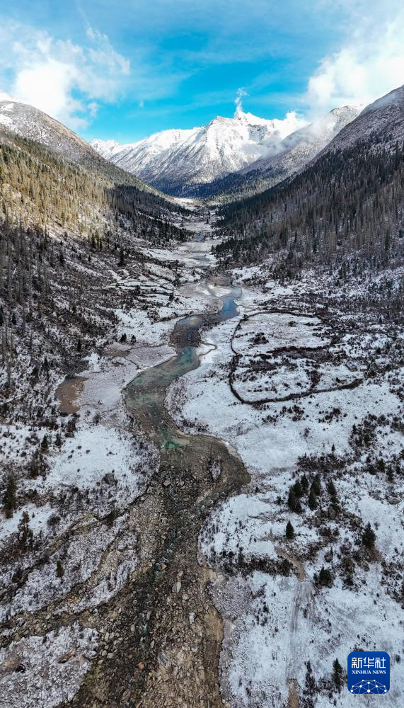 秋冬之交,四川省甘孜藏族自治州德格县境内的多瀑沟景区迎来一场降雪。旭日初升,日照金山。山巅云雾袅绕,河谷浅溪淙淙,藏房灌木掩映,勾勒出一幅美丽的生态画卷。这里珍稀动植物种类繁多,优美的原始森林为众多野生动物提供了自由栖息的家园。