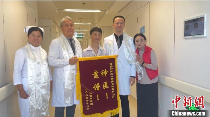12月3日,在北京协和医院接受脊柱侧弯矫形手术的藏族青年扎西能周(右三)和母亲(右一)向医院骨科一病房的医护人员献哈达并送上锦旗。 黄欣欣 摄