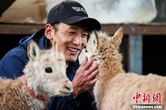 12月10日,青海省索南达杰保护站野生动物救助中心的工作人员和小藏羚羊玩耍。