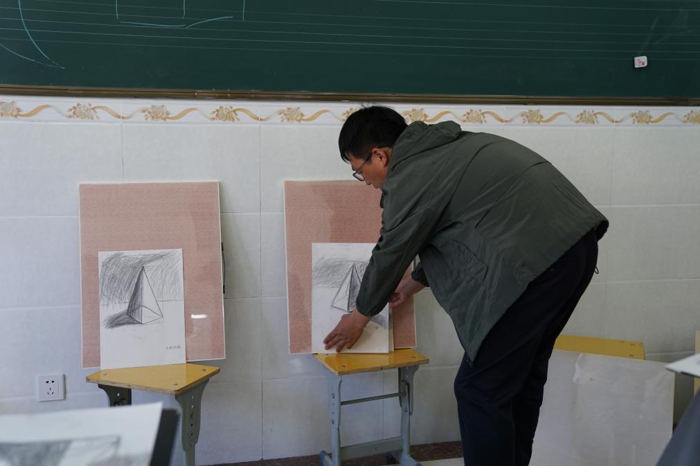 在呷拉镇片区寄宿制学校美术教室,吴蓬勃展示学生完成的素描图。新华社记者 胥冰洁 摄