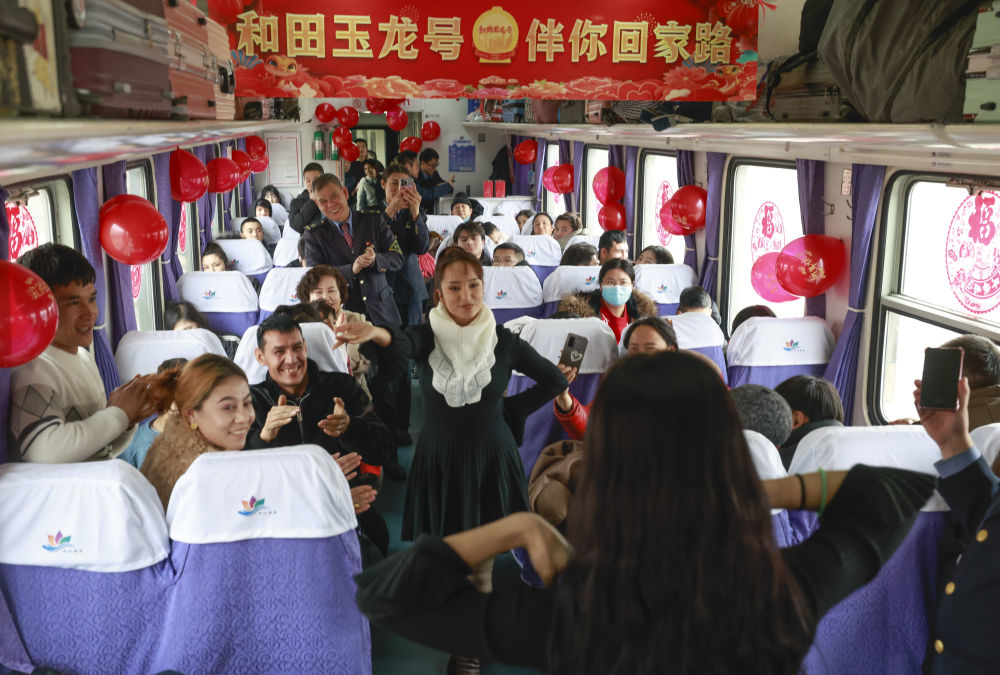 这次坐车,布麦热姆发现了新变化:车厢的连接处贴上了对联,车窗上多了喜庆的窗花。“回家后帮我妈打扫卫生,再给她包个红包。”布麦热姆说,年味十足的车厢倒是提醒他,回家要抓紧备年货了。