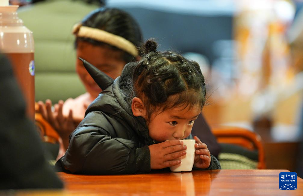 小顾客在“牧人宝库”藏式茶馆喝酥油茶(2月13日摄)。新华社记者 晋美多吉 摄