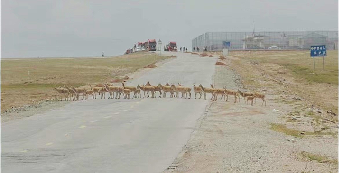 五道梁第一批回迁的藏羚羊穿过青藏公路。可可西里管理处供图
