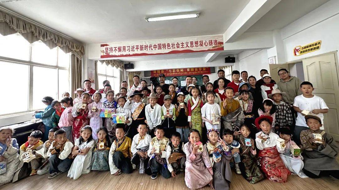 图为“七彩假期・青稞苗”志愿服务活动专题采访调研人员与学生们的合影