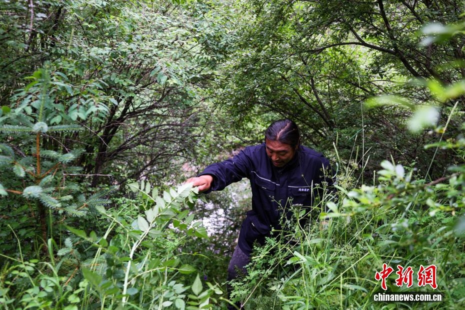 8月7日,青海省玛可河林业局友谊桥林场护林员观察植物生长情况。该林场位于青海省果洛藏族自治州班玛县,属高山峡谷原始林区,管护总面积达36.15万亩。友谊桥林场护林员承担着辖区林木生长监测、病虫害防治、火灾隐患排查、野生动物保护救助等任务,日均巡护8小时,月巡护里程近600公里。中新社记者 薛蒂 摄