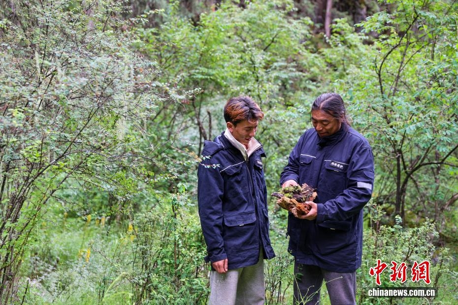 8月7日,青海省玛可河林业局友谊桥林场护林员观察野生菌生长情况。该林场位于青海省果洛藏族自治州班玛县,属高山峡谷原始林区,管护总面积达36.15万亩。友谊桥林场护林员承担着辖区林木生长监测、病虫害防治、火灾隐患排查、野生动物保护救助等任务,日均巡护8小时,月巡护里程近600公里。中新社记者 薛蒂 摄