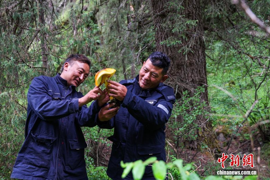 8月7日,青海省玛可河林业局友谊桥林场护林员辨别发现的野生菌。日常巡护中。该林场位于青海省果洛藏族自治州班玛县,属高山峡谷原始林区,管护总面积达36.15万亩。友谊桥林场护林员承担着辖区林木生长监测、病虫害防治、火灾隐患排查、野生动物保护救助等任务,日均巡护8小时,月巡护里程近600公里。中新社记者 薛蒂 摄