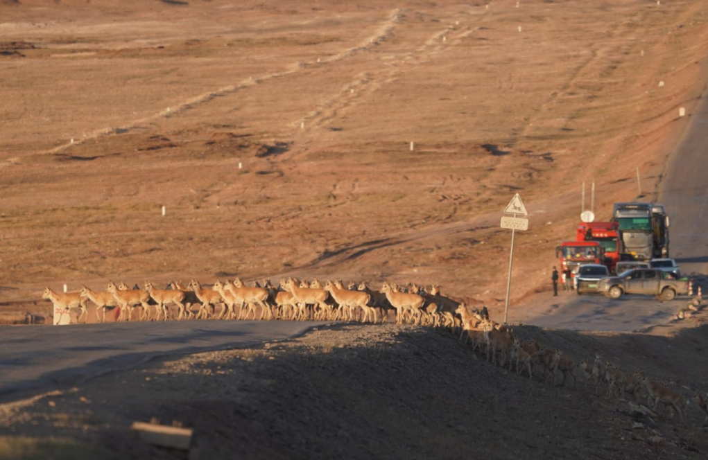 繁忙的公路突然“静音”,远处车流、人群安静等待,几只藏羚羊缓慢踏上公路,头羊反复“试探”确认安全后,羊群再迅速穿过公路。