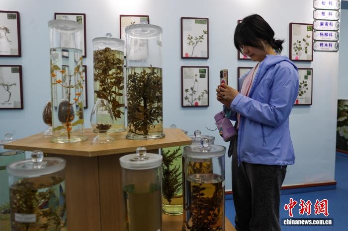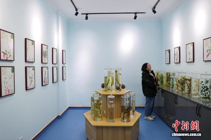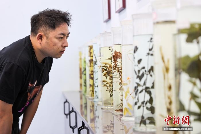 8月7日,游客在青海省玛可河林业局自然科普馆参观植物标本。该科普馆位于青海省果洛藏族自治州班玛县,馆内陈列雪豹、棕熊等珍稀高原物种标本,以及玛可河林区内数百种植物标本,系统展示高原生物多样性图谱,解锁三江源生态“密码”。中新社记者 薛蒂 摄