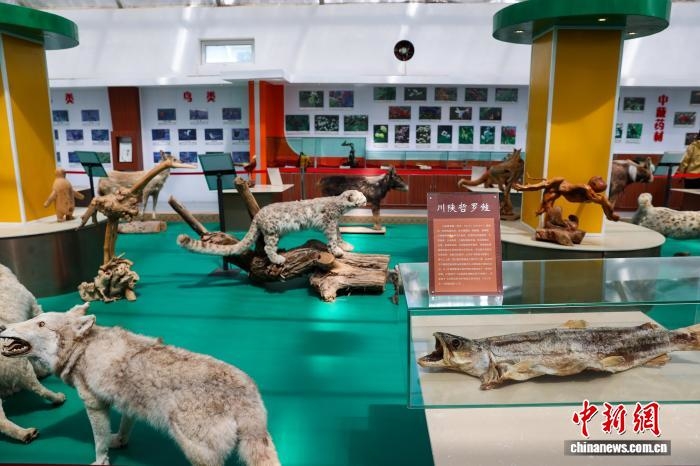 8月7日,青海省玛可河林业局自然科普馆内陈列的野生动物标本。该科普馆位于青海省果洛藏族自治州班玛县,馆内陈列雪豹、棕熊等珍稀高原物种标本,以及玛可河林区内数百种植物标本,系统展示高原生物多样性图谱,解锁三江源生态“密码”。中新社记者 薛蒂 摄