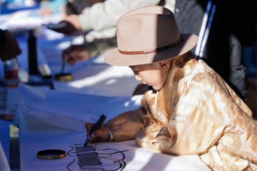 图为参加汇报展的孩子在书写藏文 主办方供图