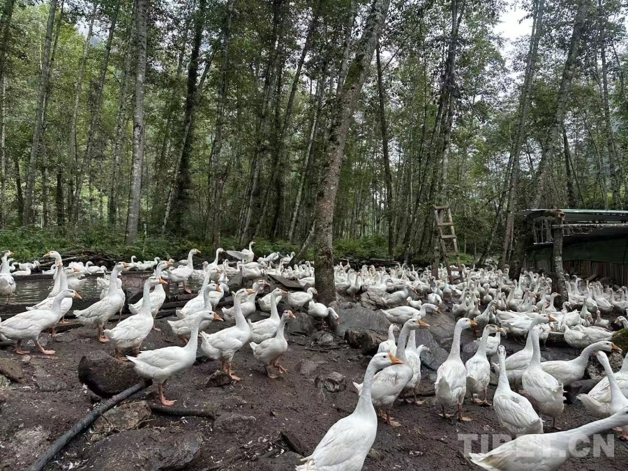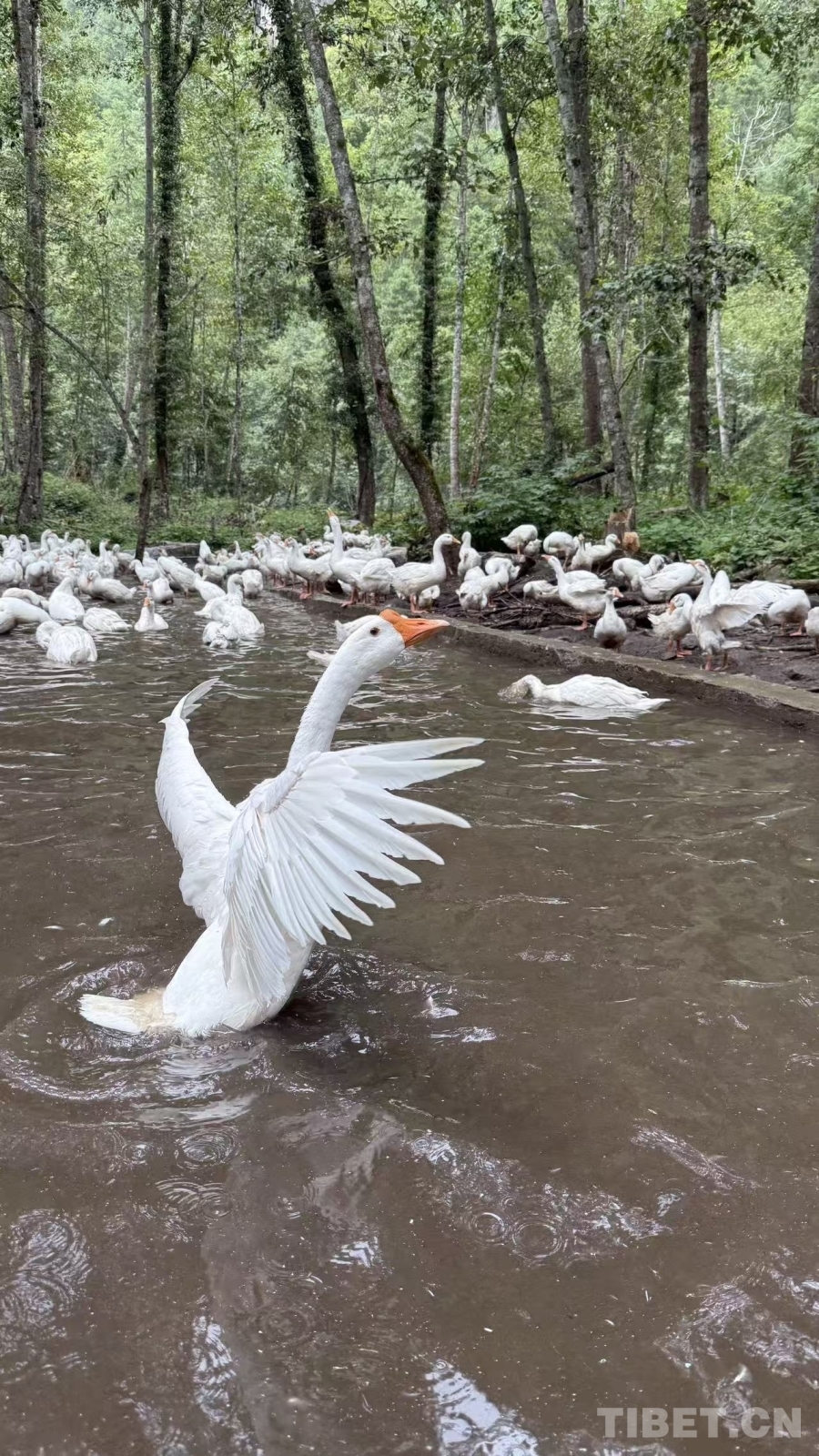 “嘎嘎——!”清晨,察隅的山雾还没散尽,上察隅镇珠联村的山林间,上千只大白鹅已经吵成一片。这些圆滚滚的“白团子” ,或扑棱着翅膀在水塘中嬉戏,引吭高歌;或憨态可掬地在林间来回踱步,啄食杂草……把这个2024年10月才成立不久的搬迁新村,搅得热闹非凡。