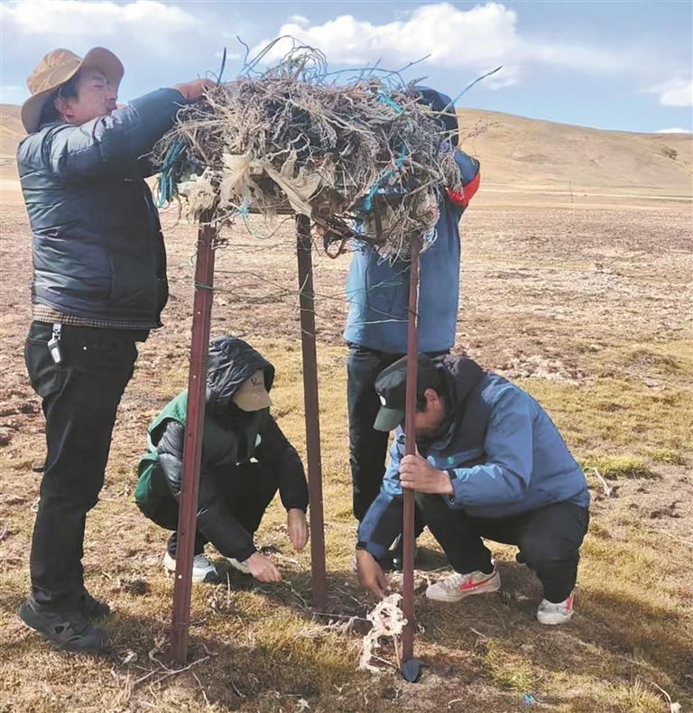 扎西(右一)和队友搭建鸟窝。