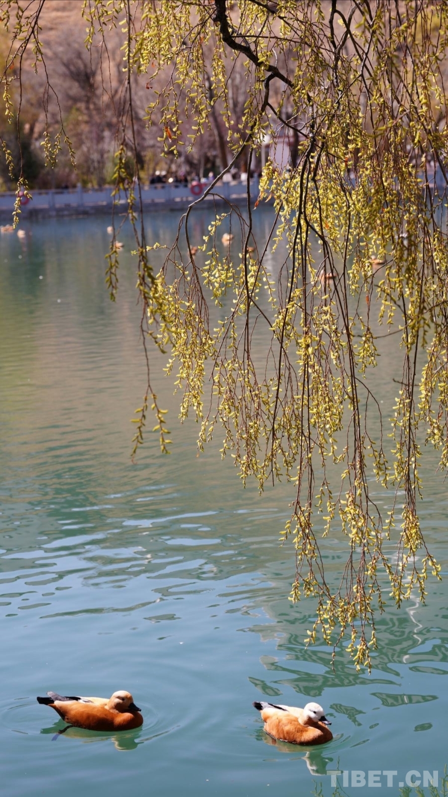 柳丝轻拂,赤麻鸭在水中悠然游弋。