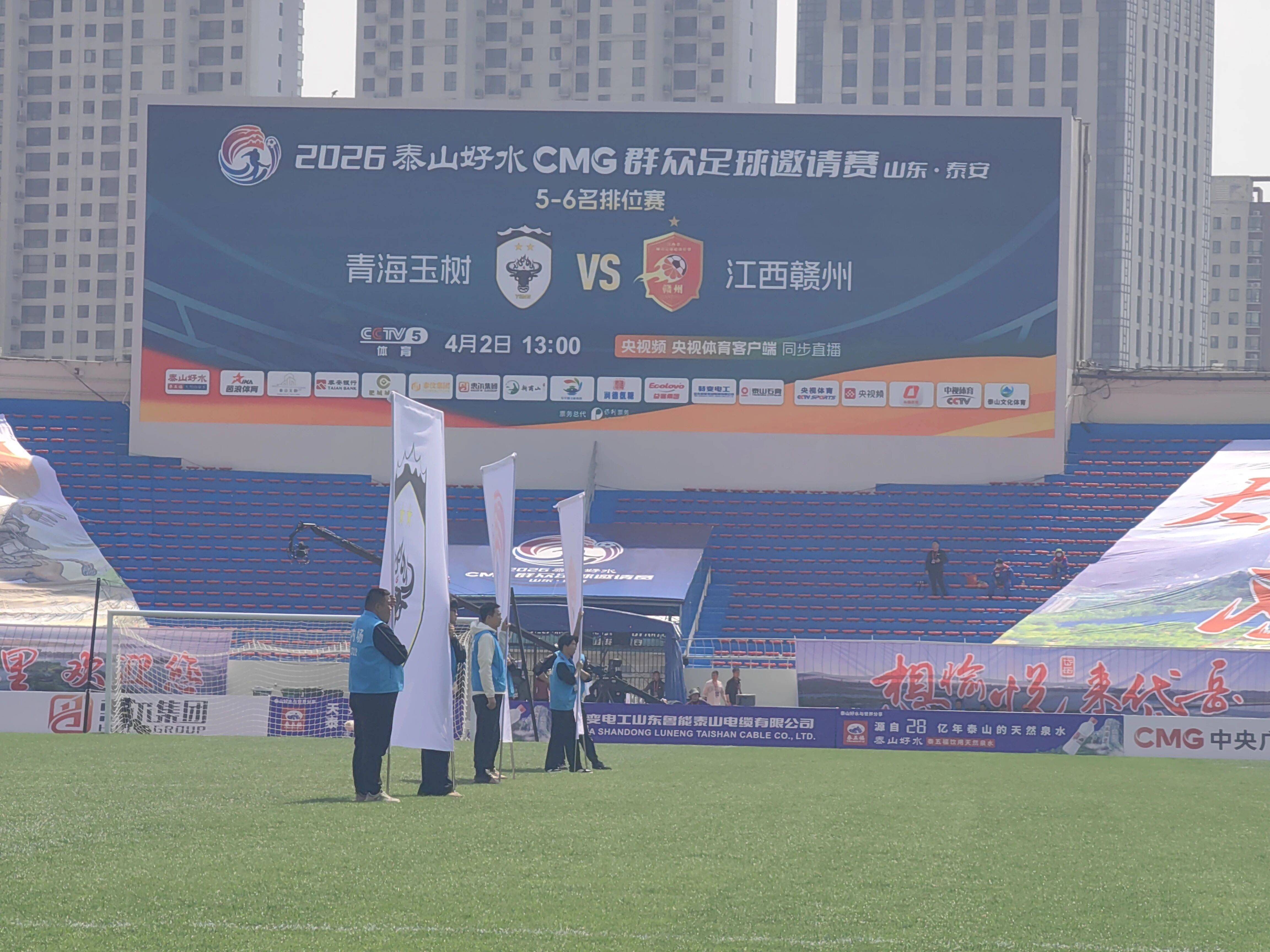 4月2日中午1时,2026“泰山好水”CMG群众足球邀请赛五六名排位赛在山东泰安体育场打响。由“青超”冠军青海玉树队迎战江西赣州队。在这场检验草根足球成色的较量中,玉树队火力全开,47号扎西梅开二度,55号阿卜杜合力力·努尔麦麦提、25号尼玛才仁、36号巴桑各入一球,最终以5:1大胜对手,斩获本届赛事第五名。