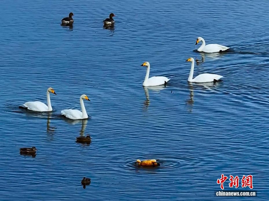 图为水鸟在湖面游弋。(无人机照片)才新木加 摄